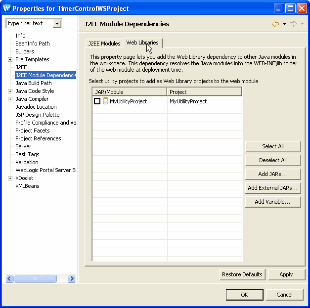 After the utility project is added, it will appear on the build path for this web project and the utility project types will be available in the IDE. Note that the Java Build Path option on the Properties dialog does not set up project dependencies correctly for Workshop projects. Adding a utility project to a web project means that the web project will access the shared copy of the utility module in the EAR. No files will be copied to the web project.