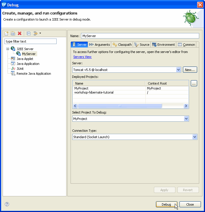 Once your server is defined, to debug an application, choose Run > Debug. The following dialog is displayed.