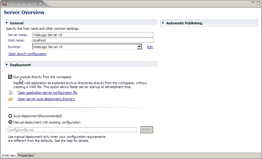 For WebLogic Server 9.0/9.1, you will see this screen that allows you to use the existing config.xml without updating. For WebLogic Server 9.0/9.1, you cannot specify the name of a custom configuration file. When you click on Manual deployment with existing configuration, the field specifying the config.xml file name is read-only and the Select button is disabled.