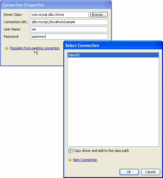 By clicking Populate from existing connection, you can use a connection that you've already set up using DbXplorer. Note that if requested, Workshop will copy the database driver library and add it to your classpath, where it will be available to your persistence code.