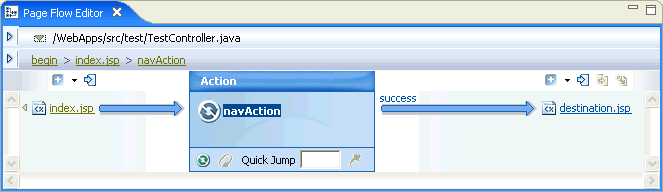 In the Page Flow Editor there should be two arrows: (1) an arrow pointing from the starting JSP page to the action method and (2) another arrow pointing from the action method to the destination JSP page.