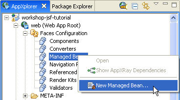 To enable the JSF framework for instantiating backing beans and storing them in the appropriate scope, you must configure it in the application configuration resource file faces-config.xml using the managed-bean XML element. The faces-config.xml file is processed at application startup time. When a page references a bean, the JavaServer Faces implementation initializes it according to its configuration in the application configuration resource file.