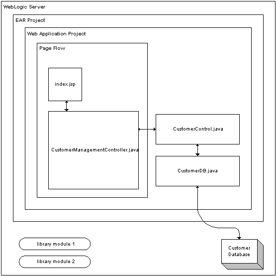 The two controls used in this tutorial allow your application to interact with a database. The first control (CustomerControl.java) is a custom Java control. The second control (CustomerDB.java) is a database control that queries the database directly. Strictly speaking, a web application needs only one control, a database control, to access a database; but two controls are used here (a database control with a wrapper custom control) to increase the modularity of the application. Details about this modularity are provided in step 2 of this tutorial.