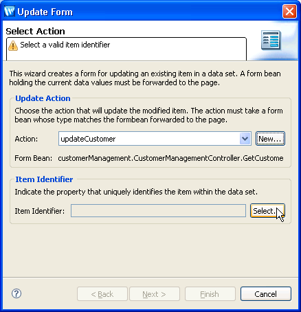 from the Form Bean dropdown list, select customerManagement.CustomerManagementController.GetCustomerByIdFormBean.