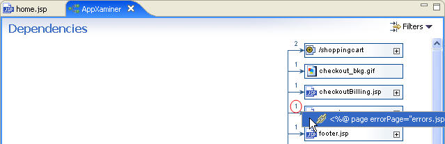 AppXaminer outlines all of the dependencies going into and coming out of the home.jsp node. Expanding the branch next to a resource, such as errors.jsp, allows you to easily drill down through multiple levels to analyze the dependency chain and traverse the flow through the application. Double-clicking a dependency will open in it in the appropriate editor.