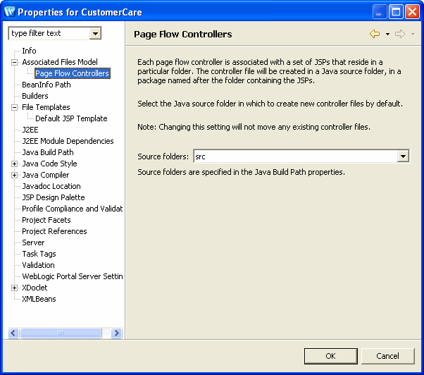 To open this dialog, select Project > Properties > Associated Files Model > Page Flow Controllers.
