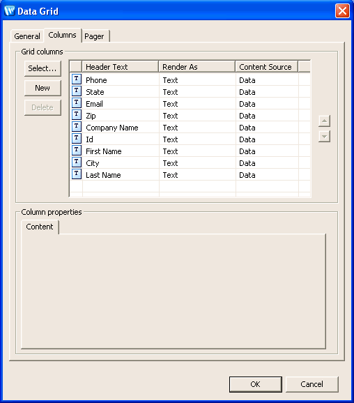 The Grid columns area specifies the properties for a given column in the rendered HTML table.