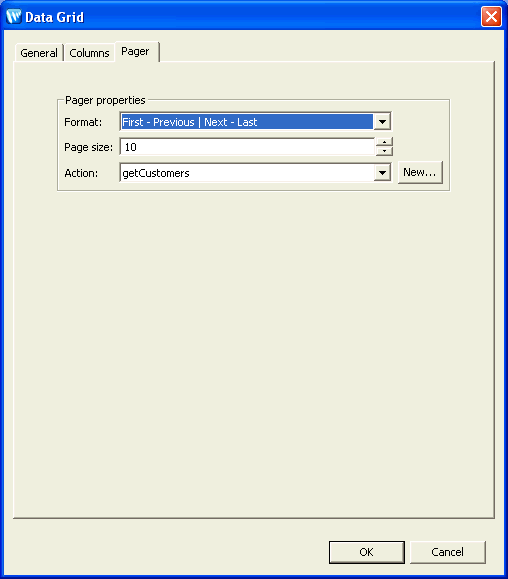 The Pager tab specifies properties for links that navigate through the HTML table.