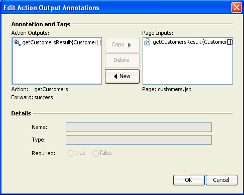 Use this dialog to specify the contract between action outputs and page inputs. Action outputs document the data objects passed along a given forward; page inputs document the data objects expected by a given JSP. For more information see Page Inputs and @Jpf.ActionOutput in the NetUI documentation.