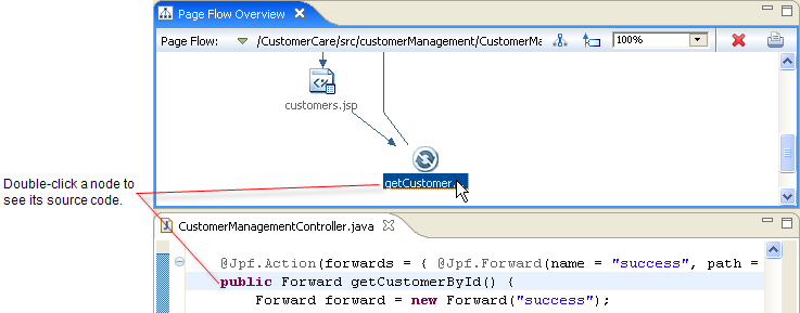 The Page Flow Overview gives a complete view of a page flow, including all of its pages, actions, and forwards.