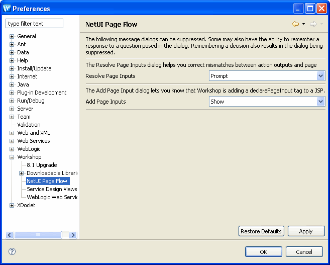 To open this dialog, select Window > Preferences > NetUI Page Flow.