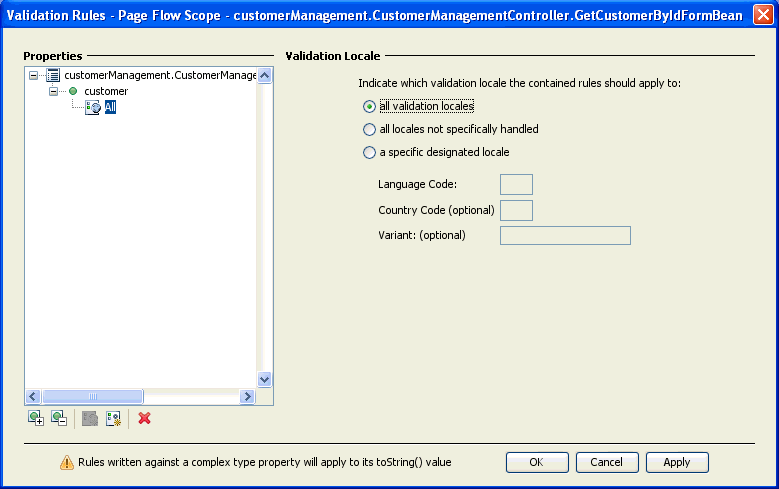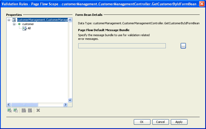 The top level node in the Properties area shows the form bean to which validation applies. In the image above validation is applied to the form bean customerManagement.CustomerManagementController.GetCustomerByIdFormBean.