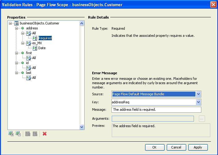 (3) Page Flow Default Message Bundle: on this setting, the value of Display Name specifies the message key used to retrieve the error message from the default message bundle. (To set the message bundle file, see Validation: Set Message Bundle.)