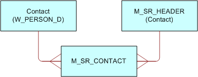 In the illustration, the tables M_SR_HEADER (Account) and M_SR_HEADER (Contact) are examples of this type of alias.