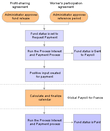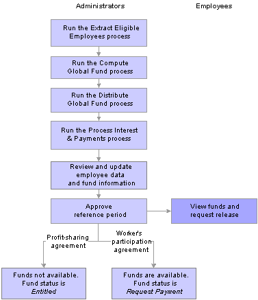 Typically, you run the first three processes (Extract Eligible Employees, Compute Global Fund, and Distribute Global Funds) once for each reference period. However, you run the Process Interest and Payment process at intervals, because it processes payments, updates interest amounts and fund status, and calculates funds.