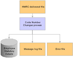 After submitting the information generated by the Pay/Pension Identity Numbers process, HMRC processes the information and sends the new tax codes back on magnetic tape. Use the Code Number Changes process to update employees’ tax data based on the file received from HMRC.