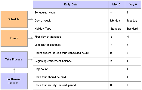 The primary job of the take element is to determine paid and unpaid units. The Take process expands each absence event into daily data and generates positive input for the pay run. It also updates balance accumulators.