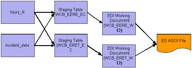 You enter and change the data on the pages and the original tables. There is no way to edit the data in the intermediate, or staging, tables. The system uses SQRs to perform the processing required to move data from its normal application table into staging tables that have an EC suffix. The staging tables in turn have a one-to-one correspondence with the working document tables that have a WD suffix. These tables define the precise record format necessary in the EDI ASCII file. The EDI manager runs an SQR to produce the actual EDI ASCII file. The name of the ASCII file is defined by WCB in the form of xxxxxyyy.yyb, where xxxx is the electronic correspondence ID, yyyyy represents the last five digits of the message number, and b is an identifier that is used to show whether compression or encryption is used. The file is compressed in ZIP format before email submission to WCB.