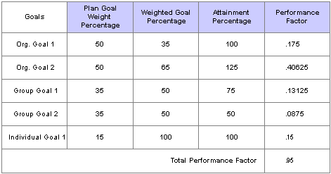 Plan Goal Weighted Percentage × Weighted Goal Percentage × Attainment Percentage = Performance Factor