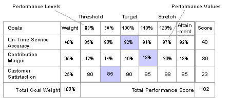 The system calculates the score for each goal by multiplying the goal weight by the percentage of the performance level at which the attainment value falls. The total performance score is the sum of the scores for all goals in the matrix. The system determines the payout formula based on where the total performance score falls on the payout schedule. |