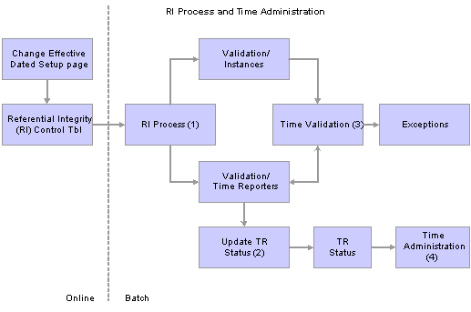 Time and Labor provides several batch processes to ensure that data is error-free when information changes online or when the system performs batch processing through Time Administration. Two of these processes are Referential Integrity (RI) and Time Validation. The system uses default processing to determine the correct information for processing time.