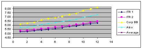 Alternatively, you can create curves by performing operations on two or more existing curves and designating the interpolation method that provides the desired result. For example, you can create a term structure by averaging the LIBOR and CD yields to comprise the overnight to two-year rates and arrive at the two-to-ten-year rate by using treasury notes and positively shifting by 150 basis points. By including the 30-year treasury bond rate, you can complete construction of the newly defined curve. A credit spread curve can be constructed by subtracting the risk-free curve from a curve that is composed of corporate bonds.