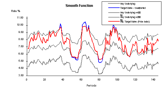 The following illustration represents these concepts. Here, the price index is evaluated against key underlying values in a smooth function. The unadjusted target value is evaluated against the key underlying rate for reasonableness. This test can be defined as a spread against the key underlying. This test ensures that the unadjusted target value never falls out of this reasonableness range, regardless of the absolute level of interest rates.