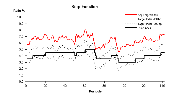 Movement of the step function is defined by the criteria in a range that you specify that affects a change in the price index value. The step function range is defined as a minimum and maximum spread relative to the adjusted target index. As long as the price index value stays within this range, it does not change. If the price index drifts below or above the range (for a consecutive period of time that is also defined by the user) it is adjusted upward or downward. The level of adjustment may be defined to be an absolute move or a percentage of the difference between the current rate and the target index. The following graph illustrates this concept: