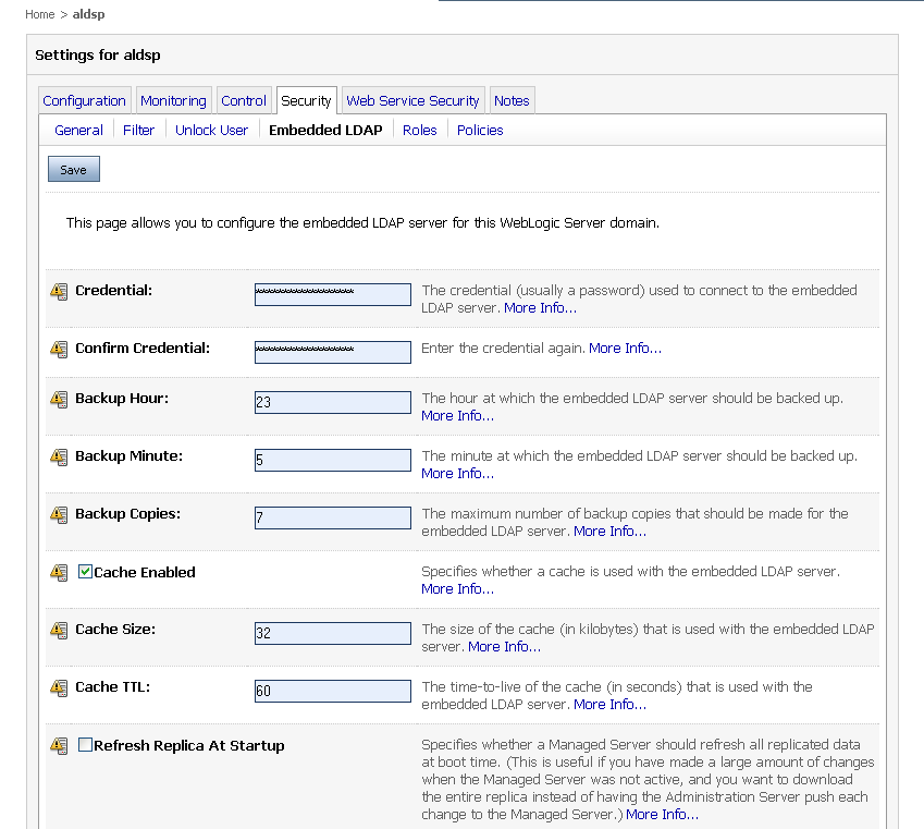 Setting the Embedded LDAP Server CredentialsYou need to set the credentials for the embedded LDAP server to match the password configured for the sample application. To configure the LDAP server credentials: