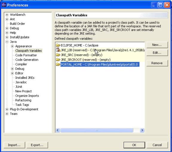 In the New Variable Entry window, enter PORTAL_HOME as the Name for the variable and click the Folder button. Navigate to PT_HOME\ptportal\5.0. Click OK to accept the location and click OK again to close the Preferences window.