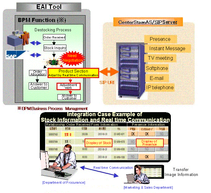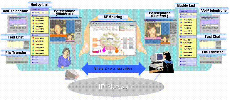 This package provides the environment where the registered members can communicate after understanding other members' situation by using the buddy list (presence) which displays real-time situation of the members. The packaged AP services, such as IP telephony, video telephony and meeting, and chat, bring real-time correct communication between two remote users, which can enhance the efficient operation of business. EAI & Communication Package Example
