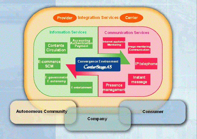 CenterStageAS can seamlessly integrate information services and communication services by providing the following two development environments. Service providers can create and provide value-added information-communication converged services and service users can make efficient use of their legacy resource in their communication environment.