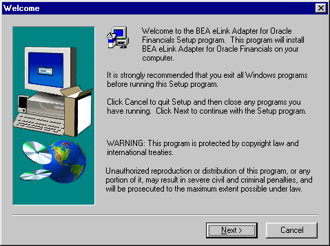 Note: If you select No, the installation continues but an error is generated in the ulog.mm/dd/yy file indicating that the product is unlicensed. Please refer to the "Using the License Key" section of the BEA eLink Adapter for Oracle Financials Release Notes for instructions on using the license file.