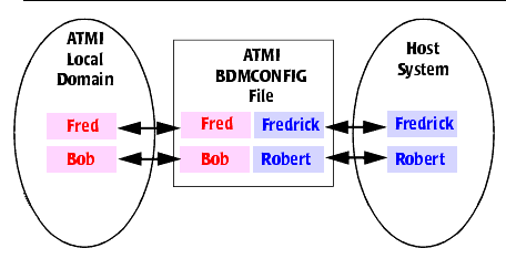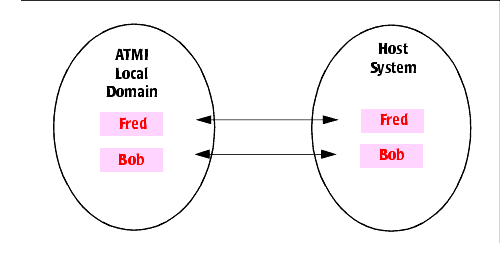 ATMI-to-host user ID mapping associates a user ID in the local domain with a corresponding user ID in the host system. With ATMI-to-host user ID mapping, an ATMI user ID can be different from its counterpart on the host. See Figure4-2.