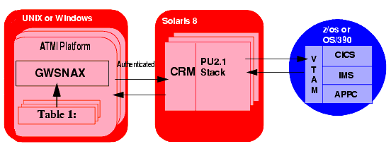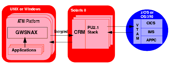 In addition to encryption, eLink Adapter for Mainframe uses an authentication process to establish secure communications between the CRM and Gateway over a distributed network.
