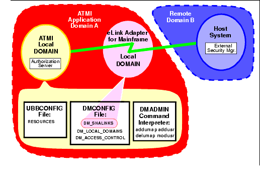 User IDs are used to control access to system resources in the ATMI and mainframe environments. For user IDs to be used by those ATMI and mainframe environments, both sides must have security mechanisms in place. For the ATMI domain, the security mechanism is the Authorization Server. For the host system, the security mechanism is the External Security Manager. Figure4-1 shows eLink Adapter for Mainframe security elements.