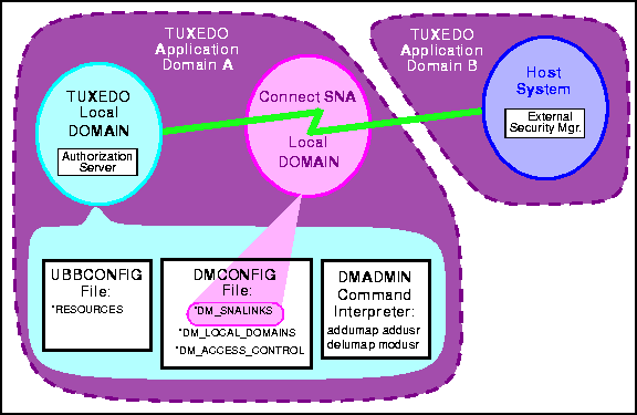 The Please refer to You can manually start When you start Please refer to Please refer to In order for any security checking to occur, the TUXEDO Local Domain and the Host System must have security mechanisms in place. For the Local Domain, this is the Authorization Server. For the Host System, this is the External Security Manager. Figure 5-1 shows these elements.