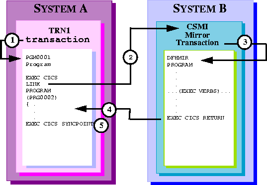 TRN1, invokes program PGM0001 executing on CICS/ESA System A.