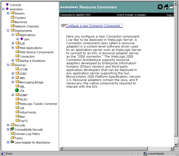 After installing the WebLogic JAM JCA Adapter, you may configure it using the Edit Connector Descriptor link of the WebLogic Administration Console. For more information on the Connector Container options in WebLogic Server, refer to the WebLogic Server documentation.
