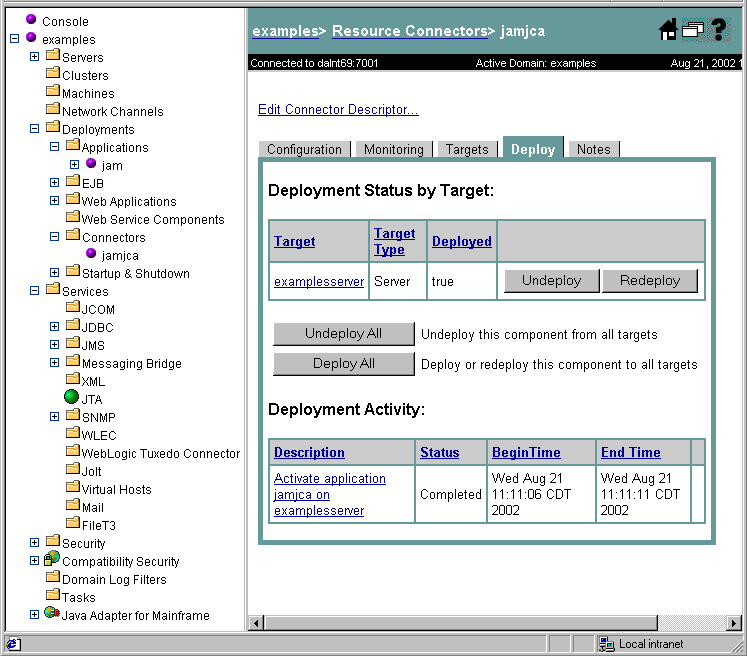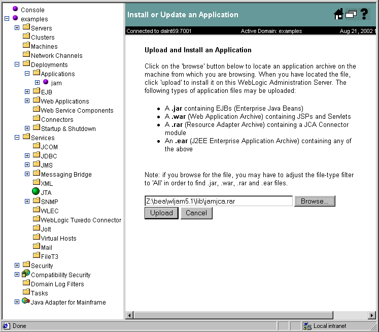 Deployment of the WebLogic JAM JCA Adapter via the WebLogic Administration Console is accomplished as follows: