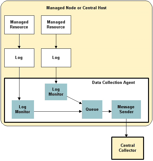 A Data Collection Agent resides on a managed node or the central host. A Data Collection Agent consists of a Message Sender, a queue, and one or more Log Monitors. The following figure shows the flow of log information from managed resources through a Data Collection Agent to the Central Collector.