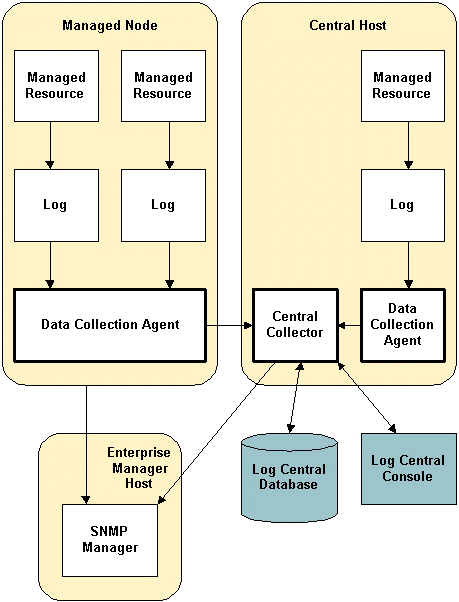 Log Central is based on an agent/manager architecture as shown in the following figure. A managed node is a machine that has resources that need to be managed. A managed resource is a software component such as a BEA Tuxedo application, an operating system, or an RDBMS. The central host and each managed node has a Log Central Data Collection Agent. The Data Collection Agents forward log messages to the Central Collector, which stores log messages in a database and provides information to the Log Central Console. Data Collection Agents and the Central Collector can generate SNMP traps. The Log Central Console, the Central Collector, and the Log Central database play the manager role in the Log Central architecture.