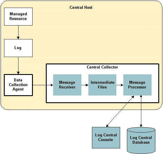 The Central Collector resides on the central host and consists of a Message Receiver, intermediate files, and a Message Processor. The following figure shows the flow of log information in the Central Collector.