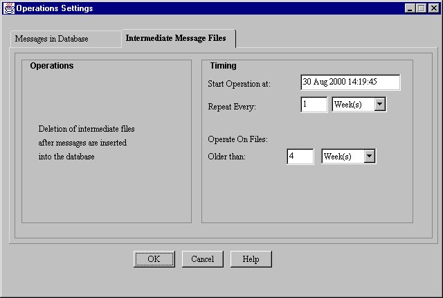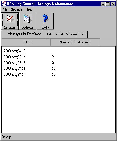The Messages in Database tab displays the number of messages delivered to the database during each hour of the day. The Intermediate Message Files tab displays the names of the Central Collector's intermediate files. |