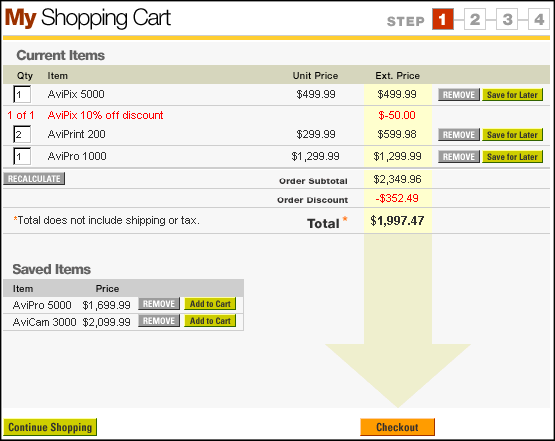 Having clicked the REMOVE button in the shopping cart's step1.jsp portlet's Saved Items list, the page was refreshed with updated data for the same portlet. The product item you selected has been removed from the Saved Items list.