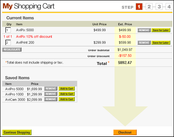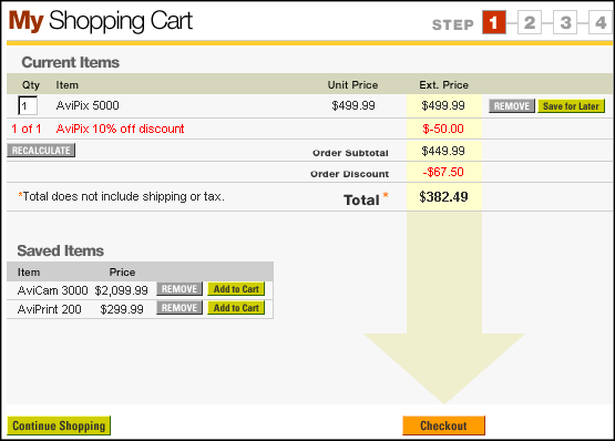 To continue the tour, click the REMOVE button next to an item on the cart's Current Items list.