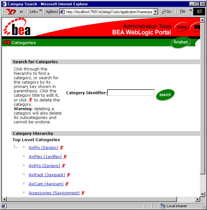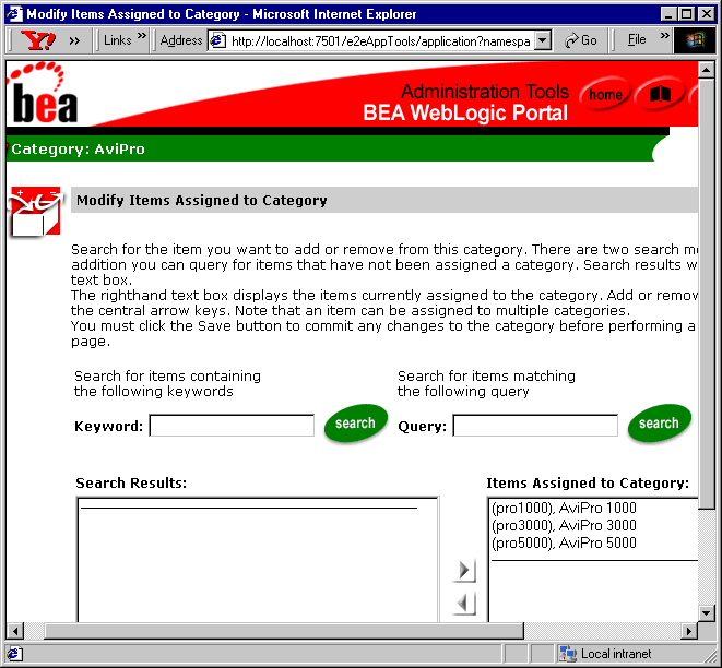 The My Avitek portal page presents a number of portlets to give the logged-in user a personalized view of the site. The My Avitek page is one of three tabbed pages in the b2cPortal. In the BEA_HOME directory where you installed WebLogic Platform, you will find the files that comprise the e2eApp in the following locations: