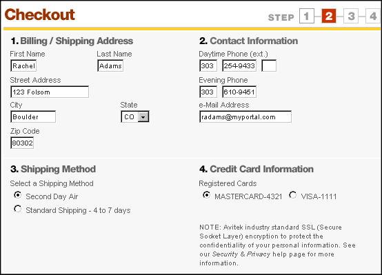 The step2.jsp Checkout portlet presents pre-set billing and shipping information for logged-in user Rachel Adams. To keep the scope of this sample application simple, we did not include portlets that would allow the user to enter or modify their credit card or shipping information. However, WebLogic Portal supports this type of processing, and provides a separate sample to demonstrate it. Please refer to the Commerce and Campaign Features Tour in the WebLogic Portal documentation.