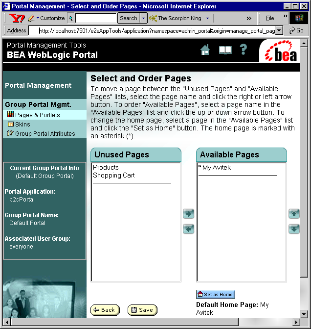 Once the URL was passed to the browser for the b2cPortal application, why was the My Avitek page the first page displayed? The default page was defined in the WebLogic Portal Administration Tools. For details on this and other characteristics of the My Avitek page, see the next section.
