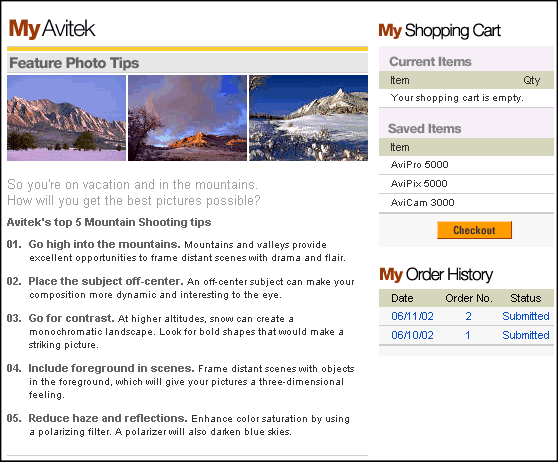 If this is your initial tour, and no other user has logged in as Rachel Adams on a shared server instance, the shopping cart and order history are empty. The following screen shows a My Avitek page for a user who has already completed two orders.